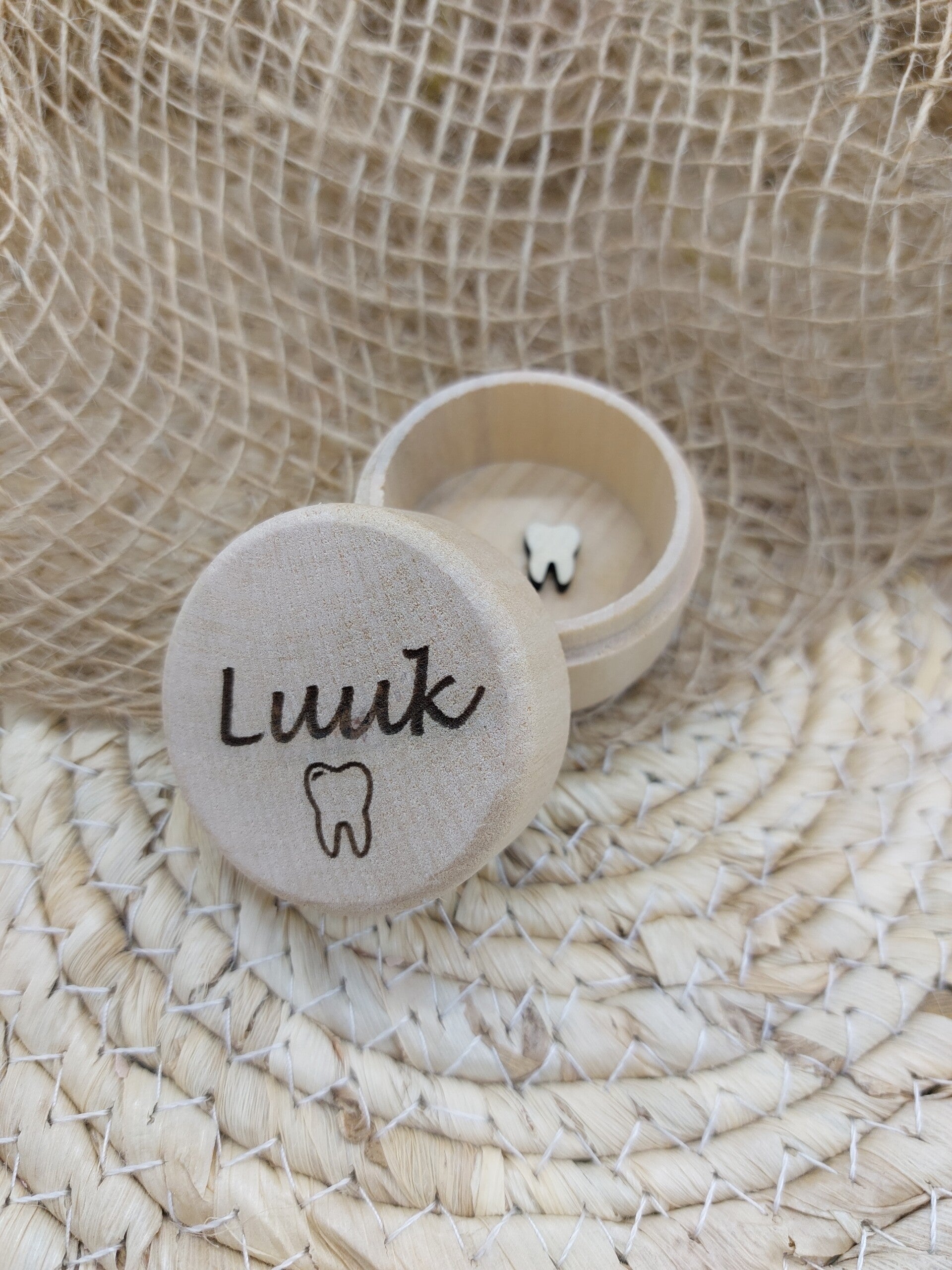 Bewaar de melktandjes van je kind op een unieke en stijlvolle manier met dit prachtige houten tandendoosje.